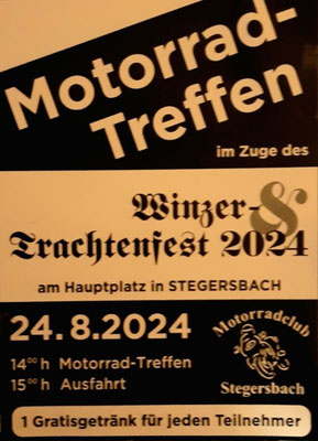 Das beste und schönste Motorradtreffen des Südburgenlandes fand im Zuge des Stegersbacher Winzerfestes statt. An die 150 Biker und Bikerinnen sowie diverse Motorradclubs folgten den Ruf des MC Stegersbach und ihres Präsi Otmar Wagner.